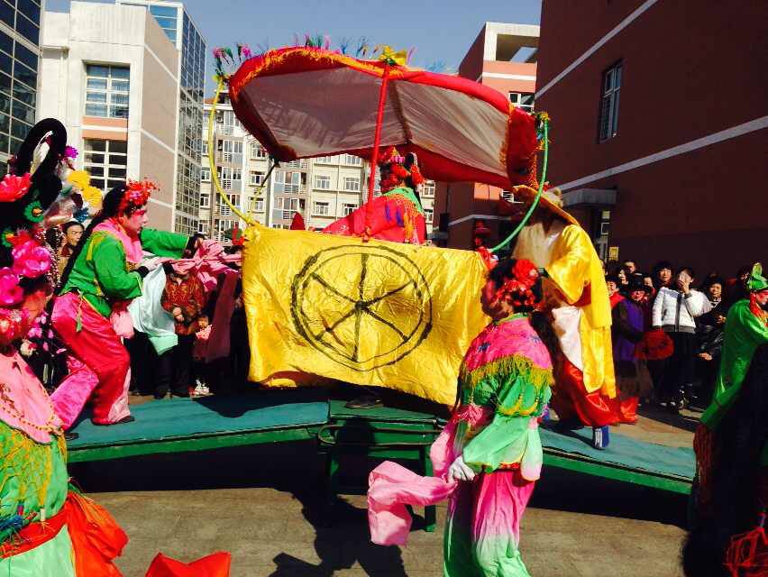 演出时首先是文武场登场,以鼓、锣、镲(二或三或四人出演均可)、唢呐、笙、钹等演奏节奏感强烈的序曲,开场聚人。接着踩着鼓点出场主要演员,首先是七对人物率先出场:第一对是漂亮帅气的公子和他的媳妇。第二对是浪荡好色的公子韩龙和他的小妾。第三对是丑角咧子和他的媳妇。第四对是丑角衙役和一身雪白服装的寡妇。第五对是丑角算命先生和傻子妈妈。第六对是丑角猪八戒和他的媳妇高翠兰。第七对是丑角傻儿子柱子和他的傻媳妇。突出表现的是,彩车部分的一家人:车前拉车的是妹妹,坐车的是待嫁的姐姐,还有推车的老渔翁,这是亲爷仨个。然后就是车两边帮车的大嫂和二嫂。所用的道具是:木结构桥、彩车、扇子、大羽毛扇(傻子妈妈专用)、戒尺、马鞭、木枷锁、饽饽篮子、钉耙、串铃等。