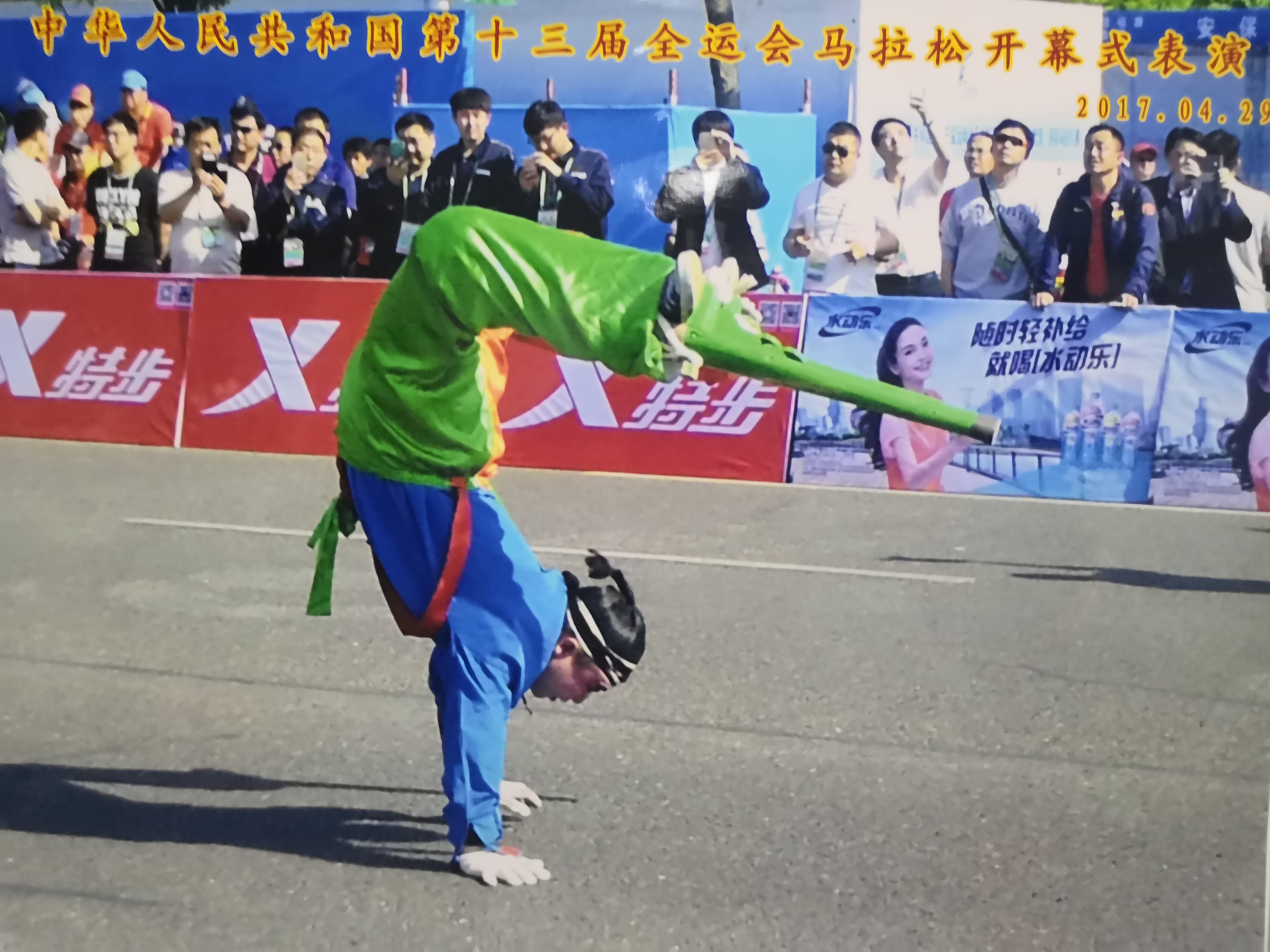 上善高跷腿子是二尺八寸高,现改为二尺六寸,表演者在脚蹬长木腿上进行跪、跳、扭、舞、劈叉、翻跃等多项惊险高难动作。