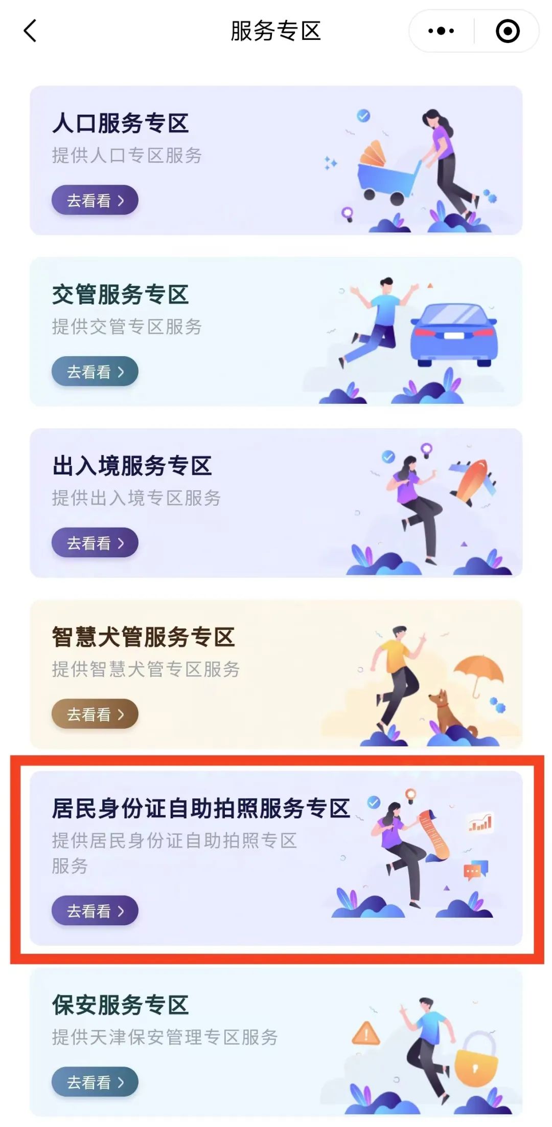 有换证需要的群众,可以登录“天津公安民生服务平台”微信小程序,在下方的服务专区栏目的“更多”选项里面找到“居民身份证自助拍照服务专区”,填写办证人信息后,即可以在家自助完成拍照,不限次数,直到拍到自己满意的照片为止。