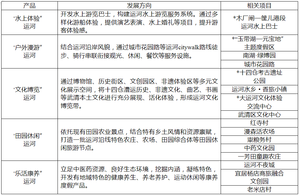 发展“运河文化游”方面:整合大运河武清段文化旅游资源,以运河文化、漕运文化为背景,繁荣两岸、活跃水面、突出特色、水岸结合,高标准推进运河沿线文化旅游带建设,推动文化旅游与相关产业深度融合发展。